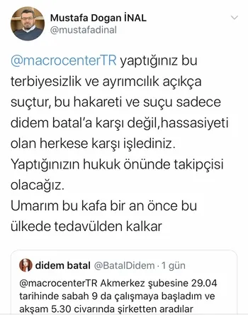 Avukat Mustafa Doğan İnal, Macro Center'in Didem Batal'a terbiyesizlik yaptığını ve ayrımcılık suçunu işlediğini belirterek, "Bu açıkça suç. Yaptığınızın hukuk önünde takipçisi olacağız" dedi.