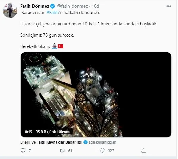 Enerji ve Tabii Kaynaklar Bakanı Fatih Dönmez "Karadeniz’in Fatih’i matkabı döndürdü. Hazırlık çalışmalarının ardından Türkali-1 kuyusunda sondaja başladık. Sondajımız 75 gün sürecek. Bereketli olsun." dedi..